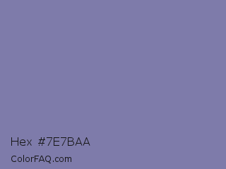 Hex #7e7baa Color is a normal indigo color and the nearest color is Shadow Blue #778ba5. Hex code #7e7baa and RGB value is rgb(126,123,170). In RGB color space, this color is composed of 49% red, 48% green, 67% blue, In CMYK color space, this color is composed of 26% cyan, 28% magenta, 0% yellow , 33% black , In HSL color space, this color has a hue angle of 244° , 22% saturation and 57% lightness.