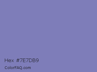Hex #7e7db9 Color is a light indigo color and the nearest color is Wild Blue Yonder #7a89b8. Hex code #7e7db9 and RGB value is rgb(126,125,185). In RGB color space, this color is composed of 49% red, 49% green, 73% blue, In CMYK color space, this color is composed of 32% cyan, 32% magenta, 0% yellow , 27% black , In HSL color space, this color has a hue angle of 241° , 30% saturation and 61% lightness.