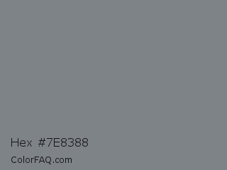 Hex #7e8388 Color is a normal blue color and the nearest color is Gunsmoke #828685. Hex code #7e8388 and RGB value is rgb(126,131,136). In RGB color space, this color is composed of 49% red, 51% green, 53% blue, In CMYK color space, this color is composed of 7% cyan, 4% magenta, 0% yellow , 47% black , In HSL color space, this color has a hue angle of 210° , 4% saturation and 51% lightness.