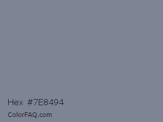 Hex #7e8494 Color is a normal blue color and the nearest color is Roman Silver #838996. Hex code #7e8494 and RGB value is rgb(126,132,148). In RGB color space, this color is composed of 49% red, 52% green, 58% blue, In CMYK color space, this color is composed of 15% cyan, 11% magenta, 0% yellow , 42% black , In HSL color space, this color has a hue angle of 224° , 9% saturation and 54% lightness.