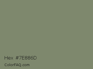 Hex #7e886d Color is a normal green color and the nearest color is Camouflage Green #78866b. Hex code #7e886d and RGB value is rgb(126,136,109). In RGB color space, this color is composed of 49% red, 53% green, 43% blue, In CMYK color space, this color is composed of 7% cyan, 0% magenta, 20% yellow , 47% black , In HSL color space, this color has a hue angle of 82° , 11% saturation and 48% lightness.