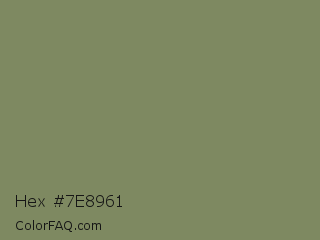 Hex #7e8961 Color is a normal lime color and the nearest color is Flax Smoke #7b8265. Hex code #7e8961 and RGB value is rgb(126,137,97). In RGB color space, this color is composed of 49% red, 54% green, 38% blue, In CMYK color space, this color is composed of 8% cyan, 0% magenta, 29% yellow , 46% black , In HSL color space, this color has a hue angle of 77° , 17% saturation and 46% lightness.
