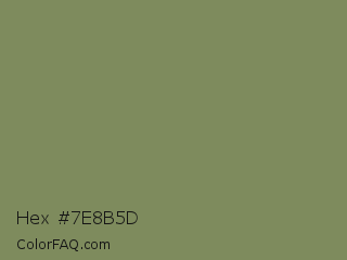 Hex #7e8b5d Color is a normal lime color and the nearest color is Flax Smoke #7b8265. Hex code #7e8b5d and RGB value is rgb(126,139,93). In RGB color space, this color is composed of 49% red, 55% green, 36% blue, In CMYK color space, this color is composed of 9% cyan, 0% magenta, 33% yellow , 45% black , In HSL color space, this color has a hue angle of 77° , 20% saturation and 45% lightness.