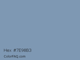 Hex #7e98b3 Color is a normal blue color and the nearest color is Weldon Blue #7c98ab. Hex code #7e98b3 and RGB value is rgb(126,152,179). In RGB color space, this color is composed of 49% red, 60% green, 70% blue, In CMYK color space, this color is composed of 30% cyan, 15% magenta, 0% yellow , 30% black , In HSL color space, this color has a hue angle of 211° , 26% saturation and 60% lightness.