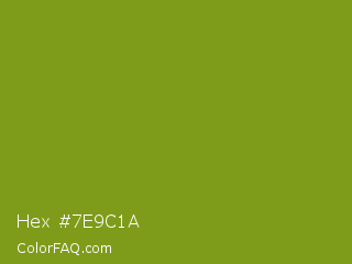 Hex #7e9c1a Color is a normal lime color and the nearest color is Trendy Green #7c881a. Hex code #7e9c1a and RGB value is rgb(126,156,26). In RGB color space, this color is composed of 49% red, 61% green, 10% blue, In CMYK color space, this color is composed of 19% cyan, 0% magenta, 83% yellow , 39% black , In HSL color space, this color has a hue angle of 74° , 71% saturation and 36% lightness.