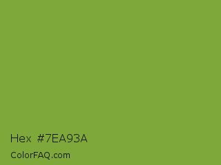 Hex #7ea93a Color is a normal green color and the nearest color is Sushi #87ab39. Hex code #7ea93a and RGB value is rgb(126,169,58). In RGB color space, this color is composed of 49% red, 66% green, 23% blue, In CMYK color space, this color is composed of 25% cyan, 0% magenta, 66% yellow , 34% black , In HSL color space, this color has a hue angle of 83° , 49% saturation and 45% lightness.