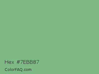 Hex #7ebb87 Color is a light green color and the nearest color is De York #7ac488. Hex code #7ebb87 and RGB value is rgb(126,187,135). In RGB color space, this color is composed of 49% red, 73% green, 53% blue, In CMYK color space, this color is composed of 33% cyan, 0% magenta, 28% yellow , 27% black , In HSL color space, this color has a hue angle of 129° , 31% saturation and 61% lightness.