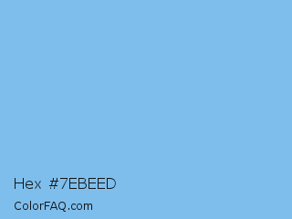 Hex #7ebeed Color is a light blue color and the nearest color is Aero #7cb9e8. Hex code #7ebeed and RGB value is rgb(126,190,237). In RGB color space, this color is composed of 49% red, 75% green, 93% blue, In CMYK color space, this color is composed of 47% cyan, 20% magenta, 0% yellow , 7% black , In HSL color space, this color has a hue angle of 205° , 76% saturation and 71% lightness.