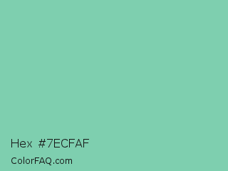 Hex #7ecfaf Color is a light green color and the nearest color is Vista Blue #8fd6b4. Hex code #7ecfaf and RGB value is rgb(126,207,175). In RGB color space, this color is composed of 49% red, 81% green, 69% blue, In CMYK color space, this color is composed of 39% cyan, 0% magenta, 15% yellow , 19% black , In HSL color space, this color has a hue angle of 156° , 46% saturation and 65% lightness.