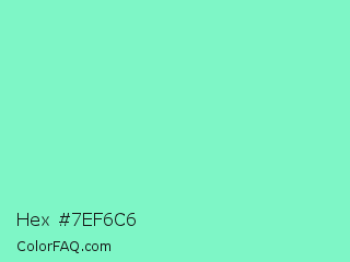 Hex #7ef6c6 Color is a light green color and the nearest color is Aquamarine #7fffd4. Hex code #7ef6c6 and RGB value is rgb(126,246,198). In RGB color space, this color is composed of 49% red, 96% green, 78% blue, In CMYK color space, this color is composed of 49% cyan, 0% magenta, 20% yellow , 4% black , In HSL color space, this color has a hue angle of 156° , 87% saturation and 73% lightness.