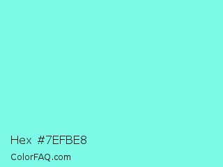 Hex #7efbe8 Color is a light cyan color and the nearest color is Aquamarine #7fffd4. Hex code #7efbe8 and RGB value is rgb(126,251,232). In RGB color space, this color is composed of 49% red, 98% green, 91% blue, In CMYK color space, this color is composed of 50% cyan, 0% magenta, 8% yellow , 2% black , In HSL color space, this color has a hue angle of 171° , 94% saturation and 74% lightness.