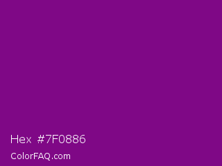 Hex #7f0886 Color is a dark magenta color and the nearest color is Patriarch #800080. Hex code #7f0886 and RGB value is rgb(127,8,134). In RGB color space, this color is composed of 50% red, 3% green, 53% blue, In CMYK color space, this color is composed of 5% cyan, 94% magenta, 0% yellow , 47% black , In HSL color space, this color has a hue angle of 297° , 89% saturation and 28% lightness.