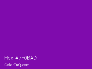 Hex #7f0bad Color is a normal purple color and the nearest color is Violet RYB #8601af. Hex code #7f0bad and RGB value is rgb(127,11,173). In RGB color space, this color is composed of 50% red, 4% green, 68% blue, In CMYK color space, this color is composed of 27% cyan, 94% magenta, 0% yellow , 32% black , In HSL color space, this color has a hue angle of 283° , 88% saturation and 36% lightness.