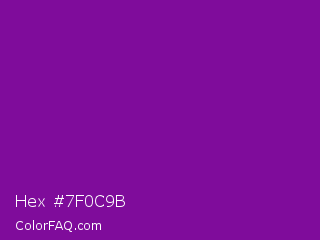 Hex #7f0c9b Color is a normal purple color and the nearest color is Dark Magenta #8b008b. Hex code #7f0c9b and RGB value is rgb(127,12,155). In RGB color space, this color is composed of 50% red, 5% green, 61% blue, In CMYK color space, this color is composed of 18% cyan, 92% magenta, 0% yellow , 39% black , In HSL color space, this color has a hue angle of 288° , 86% saturation and 33% lightness.