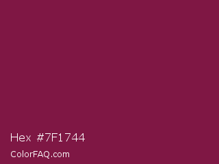 Hex #7f1744 Color is a dark rose color and the nearest color is Pansy Purple #78184a. Hex code #7f1744 and RGB value is rgb(127,23,68). In RGB color space, this color is composed of 50% red, 9% green, 27% blue, In CMYK color space, this color is composed of 0% cyan, 82% magenta, 46% yellow , 50% black , In HSL color space, this color has a hue angle of 334° , 69% saturation and 29% lightness.