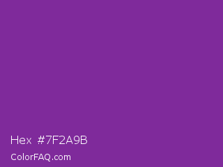 Hex #7f2a9b Color is a normal purple color and the nearest color is Vivid Violet #803790. Hex code #7f2a9b and RGB value is rgb(127,42,155). In RGB color space, this color is composed of 50% red, 16% green, 61% blue, In CMYK color space, this color is composed of 18% cyan, 73% magenta, 0% yellow , 39% black , In HSL color space, this color has a hue angle of 285° , 57% saturation and 39% lightness.