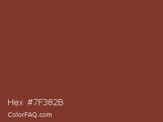 Hex #7f382b Color is a normal red color and the nearest color is Nutmeg #81422c. Hex code #7f382b and RGB value is rgb(127,56,43). In RGB color space, this color is composed of 50% red, 22% green, 17% blue, In CMYK color space, this color is composed of 0% cyan, 56% magenta, 66% yellow , 50% black , In HSL color space, this color has a hue angle of 9° , 49% saturation and 33% lightness.