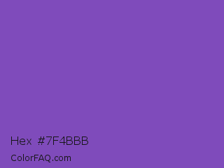 Hex #7f4bbb Color is a normal violet color and the nearest color is Fuchsia Blue #7a58c1. Hex code #7f4bbb and RGB value is rgb(127,75,187). In RGB color space, this color is composed of 50% red, 29% green, 73% blue, In CMYK color space, this color is composed of 32% cyan, 60% magenta, 0% yellow , 27% black , In HSL color space, this color has a hue angle of 268° , 45% saturation and 51% lightness.