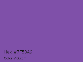 Hex #7f50a9 Color is a normal purple color and the nearest color is Royal Purple #7851a9. Hex code #7f50a9 and RGB value is rgb(127,80,169). In RGB color space, this color is composed of 50% red, 31% green, 66% blue, In CMYK color space, this color is composed of 25% cyan, 53% magenta, 0% yellow , 34% black , In HSL color space, this color has a hue angle of 272° , 36% saturation and 49% lightness.
