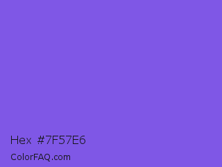 Hex #7f57e6 Color is a light indigo color and the nearest color is Medium Slate Blue #7b68ee. Hex code #7f57e6 and RGB value is rgb(127,87,230). In RGB color space, this color is composed of 50% red, 34% green, 90% blue, In CMYK color space, this color is composed of 45% cyan, 62% magenta, 0% yellow , 10% black , In HSL color space, this color has a hue angle of 257° , 74% saturation and 62% lightness.