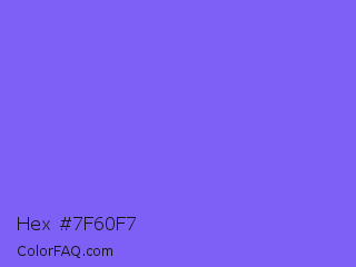 Hex #7f60f7 Color is a light indigo color and the nearest color is Medium Slate Blue #7b68ee. Hex code #7f60f7 and RGB value is rgb(127,96,247). In RGB color space, this color is composed of 50% red, 38% green, 97% blue, In CMYK color space, this color is composed of 49% cyan, 61% magenta, 0% yellow , 3% black , In HSL color space, this color has a hue angle of 252° , 90% saturation and 67% lightness.