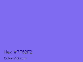 Hex #7f6bf2 Color is a light indigo color and the nearest color is Medium Slate Blue #7b68ee. Hex code #7f6bf2 and RGB value is rgb(127,107,242). In RGB color space, this color is composed of 50% red, 42% green, 95% blue, In CMYK color space, this color is composed of 48% cyan, 56% magenta, 0% yellow , 5% black , In HSL color space, this color has a hue angle of 249° , 84% saturation and 68% lightness.