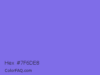 Hex #7f6de8 Color is a light indigo color and the nearest color is Medium Slate Blue #7b68ee. Hex code #7f6de8 and RGB value is rgb(127,109,232). In RGB color space, this color is composed of 50% red, 43% green, 91% blue, In CMYK color space, this color is composed of 45% cyan, 53% magenta, 0% yellow , 9% black , In HSL color space, this color has a hue angle of 249° , 73% saturation and 67% lightness.