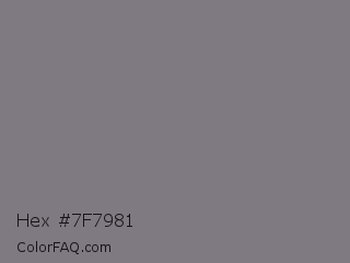 Hex #7f7981 Color is a normal purple color and the nearest color is Jumbo #7c7b82. Hex code #7f7981 and RGB value is rgb(127,121,129). In RGB color space, this color is composed of 50% red, 47% green, 51% blue, In CMYK color space, this color is composed of 2% cyan, 6% magenta, 0% yellow , 49% black , In HSL color space, this color has a hue angle of 285° , 3% saturation and 49% lightness.