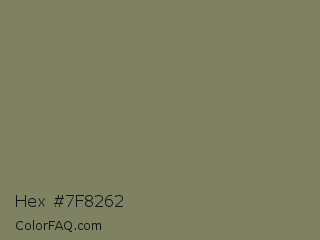 Hex #7f8262 Color is a normal yellow color and the nearest color is Flax Smoke #7b8265. Hex code #7f8262 and RGB value is rgb(127,130,98). In RGB color space, this color is composed of 50% red, 51% green, 38% blue, In CMYK color space, this color is composed of 2% cyan, 0% magenta, 25% yellow , 49% black , In HSL color space, this color has a hue angle of 66° , 14% saturation and 45% lightness.