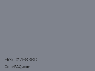 Hex #7f838d Color is a normal blue color and the nearest color is Gunsmoke #828685. Hex code #7f838d and RGB value is rgb(127,131,141). In RGB color space, this color is composed of 50% red, 51% green, 55% blue, In CMYK color space, this color is composed of 10% cyan, 7% magenta, 0% yellow , 45% black , In HSL color space, this color has a hue angle of 223° , 6% saturation and 53% lightness.