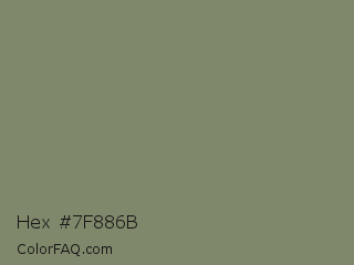 Hex #7f886b Color is a normal lime color and the nearest color is Camouflage Green #78866b. Hex code #7f886b and RGB value is rgb(127,136,107). In RGB color space, this color is composed of 50% red, 53% green, 42% blue, In CMYK color space, this color is composed of 7% cyan, 0% magenta, 21% yellow , 47% black , In HSL color space, this color has a hue angle of 79° , 12% saturation and 48% lightness.
