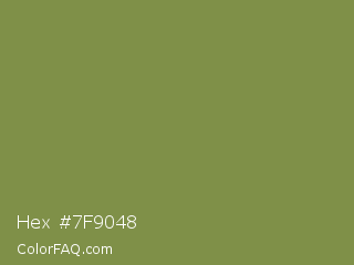 Hex #7f9048 Color is a normal lime color and the nearest color is Palm Leaf #6f9940. Hex code #7f9048 and RGB value is rgb(127,144,72). In RGB color space, this color is composed of 50% red, 56% green, 28% blue, In CMYK color space, this color is composed of 12% cyan, 0% magenta, 50% yellow , 44% black , In HSL color space, this color has a hue angle of 74° , 33% saturation and 42% lightness.