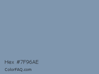 Hex #7f96ae Color is a normal blue color and the nearest color is Weldon Blue #7c98ab. Hex code #7f96ae and RGB value is rgb(127,150,174). In RGB color space, this color is composed of 50% red, 59% green, 68% blue, In CMYK color space, this color is composed of 27% cyan, 14% magenta, 0% yellow , 32% black , In HSL color space, this color has a hue angle of 211° , 22% saturation and 59% lightness.