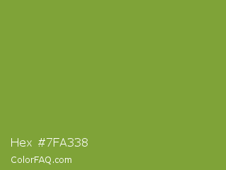 Hex #7fa338 Color is a normal green color and the nearest color is Sushi #87ab39. Hex code #7fa338 and RGB value is rgb(127,163,56). In RGB color space, this color is composed of 50% red, 64% green, 22% blue, In CMYK color space, this color is composed of 22% cyan, 0% magenta, 66% yellow , 36% black , In HSL color space, this color has a hue angle of 80° , 49% saturation and 43% lightness.