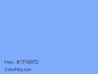 Hex #7fabfd Color is a light blue color and the nearest color is French Sky Blue #77b5fe. Hex code #7fabfd and RGB value is rgb(127,171,253). In RGB color space, this color is composed of 50% red, 67% green, 99% blue, In CMYK color space, this color is composed of 50% cyan, 32% magenta, 0% yellow , 1% black , In HSL color space, this color has a hue angle of 219° , 97% saturation and 75% lightness.