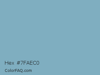 Hex #7faec0 Color is a light blue color and the nearest color is Glacier #80b3c4. Hex code #7faec0 and RGB value is rgb(127,174,192). In RGB color space, this color is composed of 50% red, 68% green, 75% blue, In CMYK color space, this color is composed of 34% cyan, 9% magenta, 0% yellow , 25% black , In HSL color space, this color has a hue angle of 197° , 34% saturation and 63% lightness.