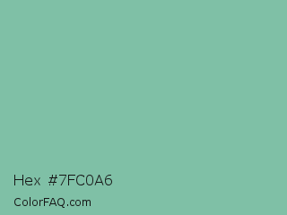 Hex #7fc0a6 Color is a light green color and the nearest color is Gulf Stream #80b3ae. Hex code #7fc0a6 and RGB value is rgb(127,192,166). In RGB color space, this color is composed of 50% red, 75% green, 65% blue, In CMYK color space, this color is composed of 34% cyan, 0% magenta, 14% yellow , 25% black , In HSL color space, this color has a hue angle of 156° , 34% saturation and 63% lightness.