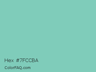 Hex #7fccba Color is a light cyan color and the nearest color is Monte Carlo #83d0c6. Hex code #7fccba and RGB value is rgb(127,204,186). In RGB color space, this color is composed of 50% red, 80% green, 73% blue, In CMYK color space, this color is composed of 38% cyan, 0% magenta, 9% yellow , 20% black , In HSL color space, this color has a hue angle of 166° , 43% saturation and 65% lightness.