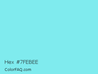 Hex #7febee Color is a light cyan color and the nearest color is Spray #79deec. Hex code #7febee and RGB value is rgb(127,235,238). In RGB color space, this color is composed of 50% red, 92% green, 93% blue, In CMYK color space, this color is composed of 47% cyan, 1% magenta, 0% yellow , 7% black , In HSL color space, this color has a hue angle of 182° , 77% saturation and 72% lightness.
