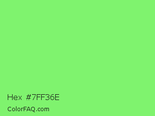 Hex #7ff36e Color is a light green color and the nearest color is Pastel Green #77dd77. Hex code #7ff36e and RGB value is rgb(127,243,110). In RGB color space, this color is composed of 50% red, 95% green, 43% blue, In CMYK color space, this color is composed of 48% cyan, 0% magenta, 55% yellow , 5% black , In HSL color space, this color has a hue angle of 112° , 85% saturation and 69% lightness.