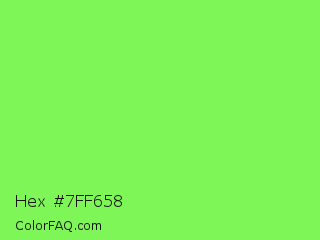 Hex #7ff658 Color is a light green color and the nearest color is Screamin Green #66ff66. Hex code #7ff658 and RGB value is rgb(127,246,88). In RGB color space, this color is composed of 50% red, 96% green, 35% blue, In CMYK color space, this color is composed of 48% cyan, 0% magenta, 64% yellow , 4% black , In HSL color space, this color has a hue angle of 105° , 90% saturation and 65% lightness.