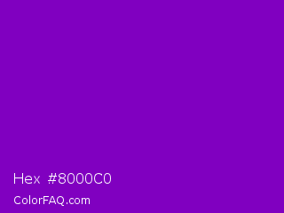 Hex #8000c0 Color is a normal purple color and the nearest color is French Violet #8806ce. Hex code #8000c0 and RGB value is rgb(128,0,192). In RGB color space, this color is composed of 50% red, 0% green, 75% blue, In CMYK color space, this color is composed of 33% cyan, 100% magenta, 0% yellow , 25% black , In HSL color space, this color has a hue angle of 280° , 100% saturation and 38% lightness.