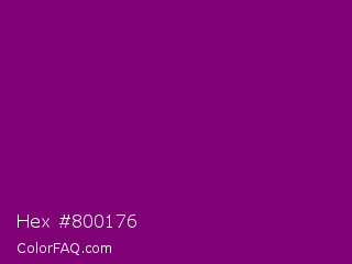 Hex #800176 Color is a dark magenta color and the nearest color is Patriarch #800080. Hex code #800176 and RGB value is rgb(128,1,118). In RGB color space, this color is composed of 50% red, 0% green, 46% blue, In CMYK color space, this color is composed of 0% cyan, 99% magenta, 8% yellow , 50% black , In HSL color space, this color has a hue angle of 305° , 98% saturation and 25% lightness.