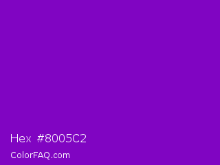 Hex #8005c2 Color is a normal purple color and the nearest color is French Violet #8806ce. Hex code #8005c2 and RGB value is rgb(128,5,194). In RGB color space, this color is composed of 50% red, 2% green, 76% blue, In CMYK color space, this color is composed of 34% cyan, 97% magenta, 0% yellow , 24% black , In HSL color space, this color has a hue angle of 279° , 95% saturation and 39% lightness.