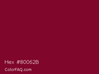 Hex #80062b Color is a dark rose color and the nearest color is Burgundy #800020. Hex code #80062b and RGB value is rgb(128,6,43). In RGB color space, this color is composed of 50% red, 2% green, 17% blue, In CMYK color space, this color is composed of 0% cyan, 95% magenta, 66% yellow , 50% black , In HSL color space, this color has a hue angle of 342° , 91% saturation and 26% lightness.