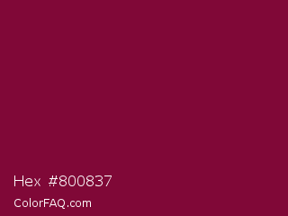 Hex #800837 Color is a dark rose color and the nearest color is Siren #7a013a. Hex code #800837 and RGB value is rgb(128,8,55). In RGB color space, this color is composed of 50% red, 3% green, 22% blue, In CMYK color space, this color is composed of 0% cyan, 94% magenta, 57% yellow , 50% black , In HSL color space, this color has a hue angle of 337° , 88% saturation and 27% lightness.