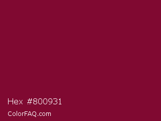 Hex #800931 Color is a dark rose color and the nearest color is Siren #7a013a. Hex code #800931 and RGB value is rgb(128,9,49). In RGB color space, this color is composed of 50% red, 4% green, 19% blue, In CMYK color space, this color is composed of 0% cyan, 93% magenta, 62% yellow , 50% black , In HSL color space, this color has a hue angle of 340° , 87% saturation and 27% lightness.