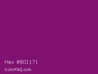 Hex #801171 Color is a dark magenta color and the nearest color is Patriarch #800080. Hex code #801171 and RGB value is rgb(128,17,113). In RGB color space, this color is composed of 50% red, 7% green, 44% blue, In CMYK color space, this color is composed of 0% cyan, 87% magenta, 12% yellow , 50% black , In HSL color space, this color has a hue angle of 308° , 77% saturation and 28% lightness.