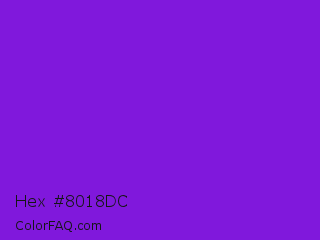 Hex #8018dc Color is a normal purple color and the nearest color is Blue Violet #8a2be2. Hex code #8018dc and RGB value is rgb(128,24,220). In RGB color space, this color is composed of 50% red, 9% green, 86% blue, In CMYK color space, this color is composed of 42% cyan, 89% magenta, 0% yellow , 14% black , In HSL color space, this color has a hue angle of 272° , 80% saturation and 48% lightness.