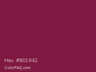 Hex #801942 Color is a dark rose color and the nearest color is Pansy Purple #78184a. Hex code #801942 and RGB value is rgb(128,25,66). In RGB color space, this color is composed of 50% red, 10% green, 26% blue, In CMYK color space, this color is composed of 0% cyan, 80% magenta, 48% yellow , 50% black , In HSL color space, this color has a hue angle of 336° , 67% saturation and 30% lightness.